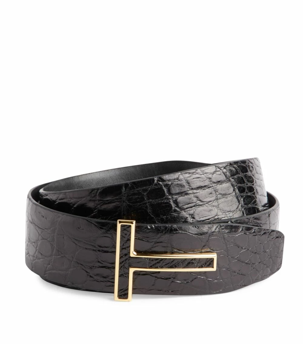 Perfectly exemplifying the label’s love of opulent accessories, this TOM FORD belt will lend an exotic touch to your formal ensembles. Crafted in Italy from natural crocodile skin for an unmistakable, textured look, it spotlights the iconic T logo in the form of a gleaming gold-tone buckle for a polished presentation.