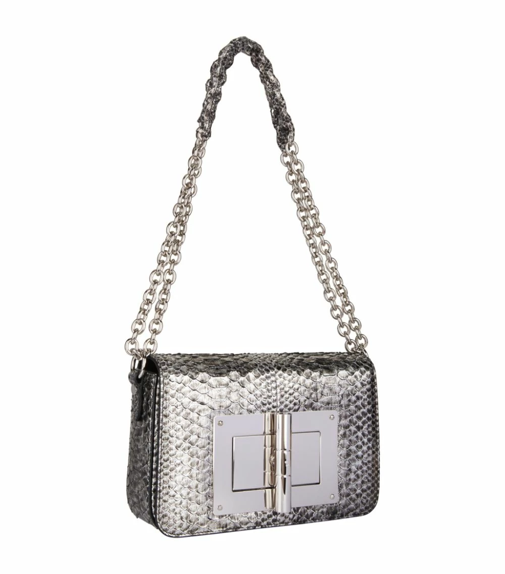 Characterised by an oversized turnlock fastening, the Natalia shoulder bag from TOM FORD is reimagined every season – cementing it as one of the label’s most coveted silhouettes. The boxy piece captures the fashion house’s love for overt glamour through a python skin composition and gleaming gold-tone hardware, while the capacious leather-lined interior provides ample space for holding all the evening essentials.