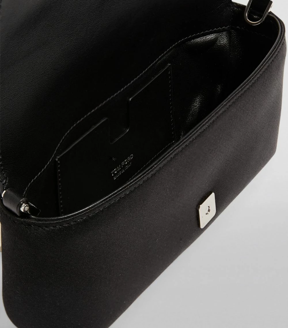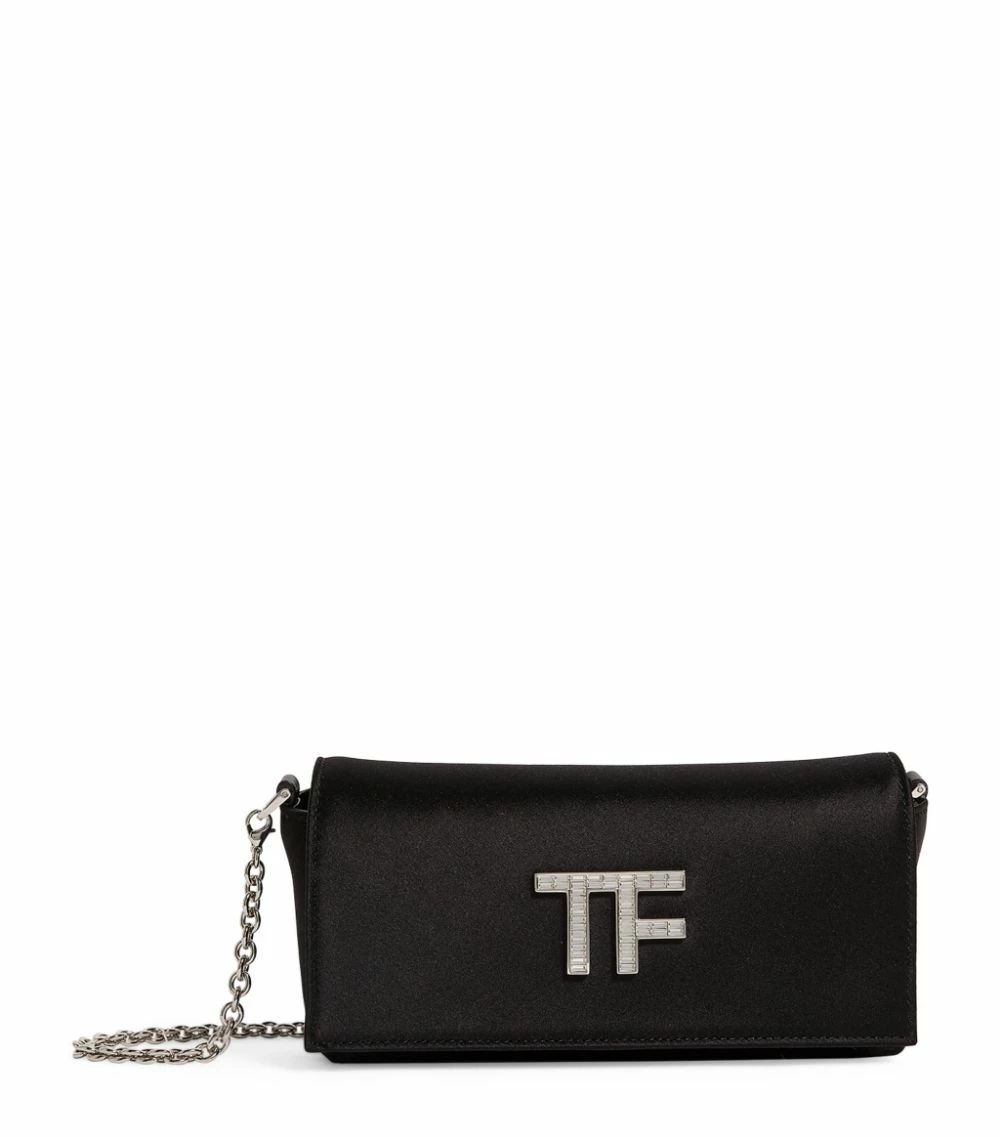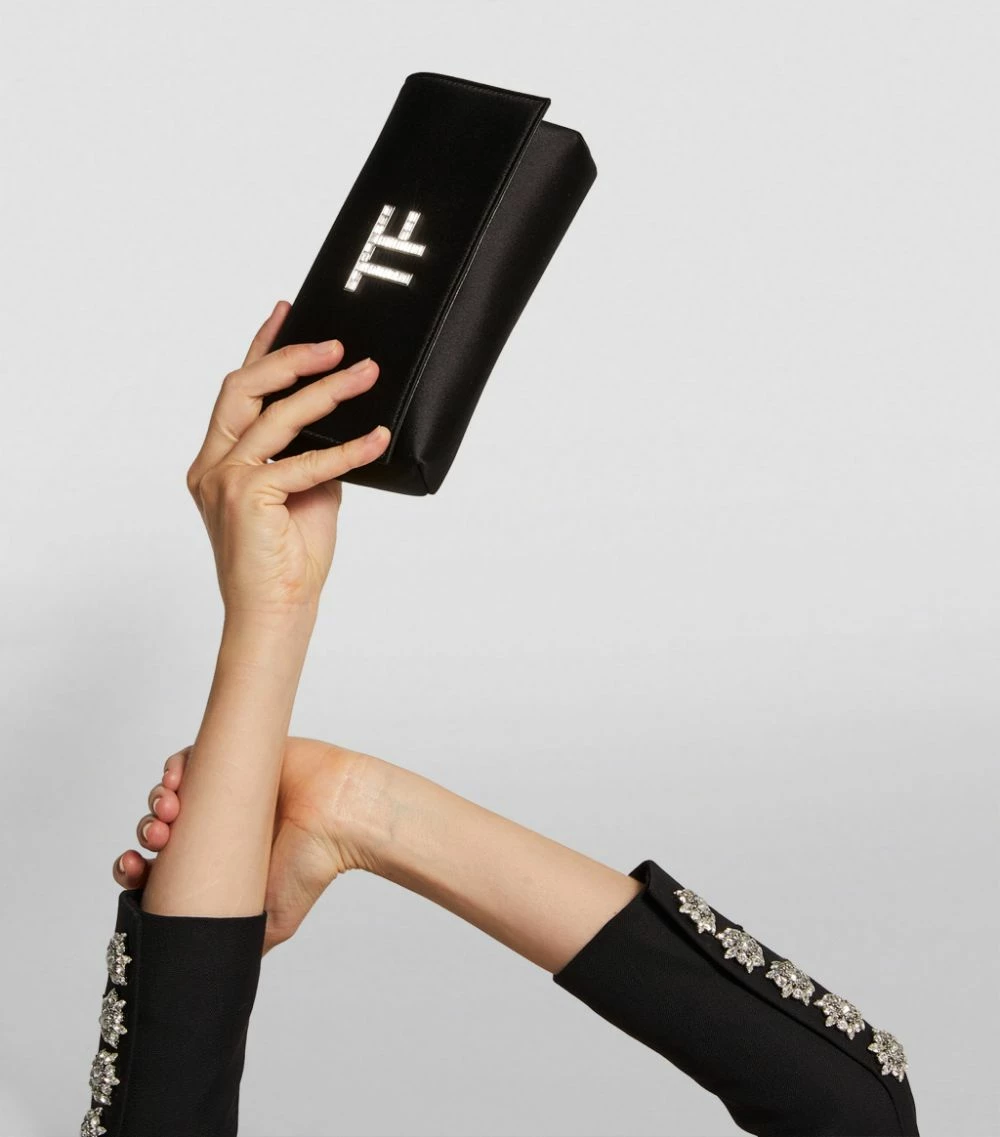 Perfect evening ensembles with TOM FORD’s elegant clutch bag. Crafted in delectably sumptuous satin, it features the iconic block-letter logo to the front in shimmering Swarovski crystals. Finished with silver-tone hardware, it makes for a sleek partner to your finest occasionwear.